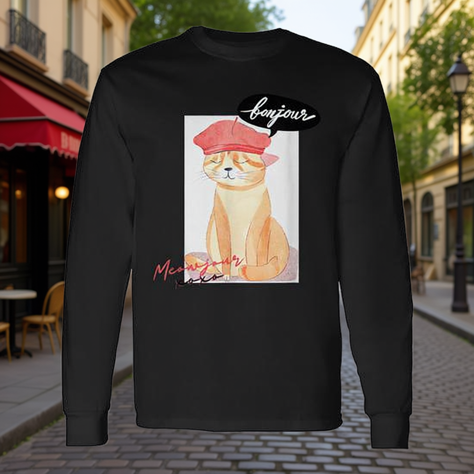 T-shirt a maniche lunghe Cat In Paris con grafica nera per uomo e donna, abbigliamento casual unisex