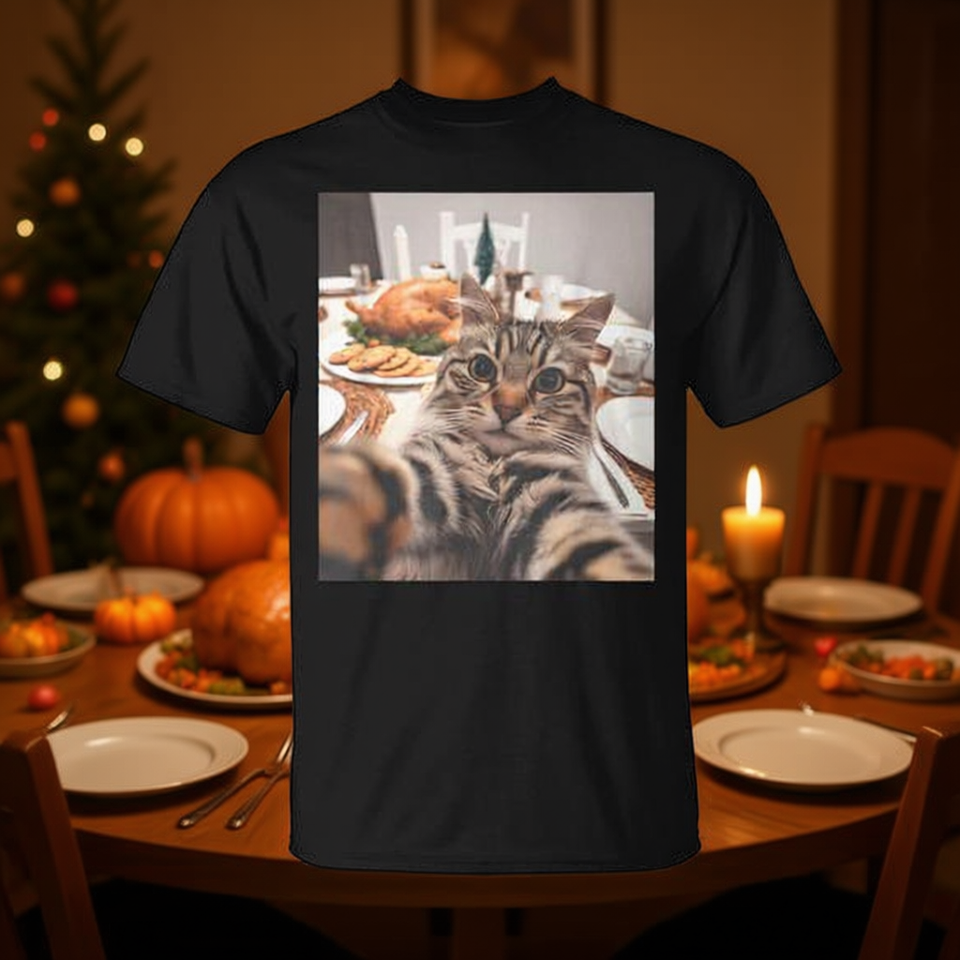 Maglietta con selfie di un gatto e tacchino per la cena del Ringraziamento