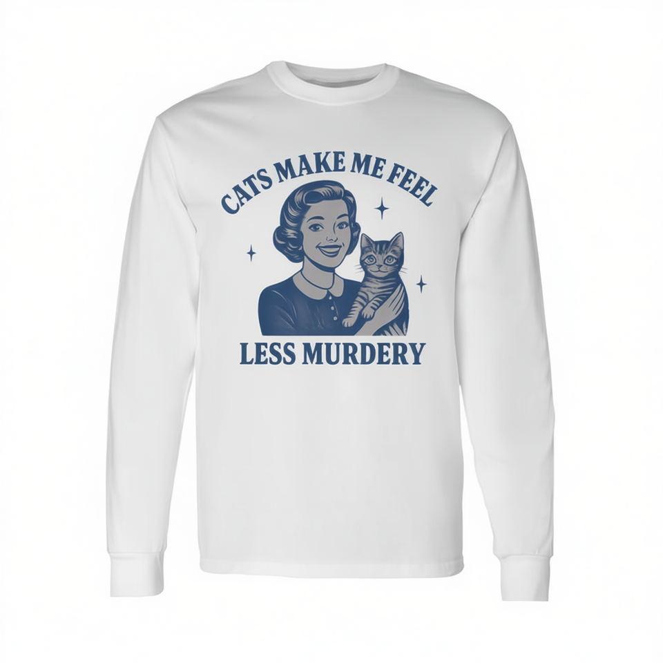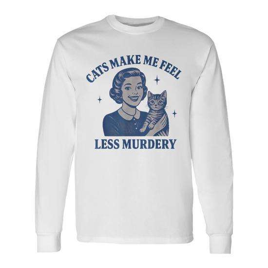 T-shirt a maniche lunghe con stampa Cats Make Me Feel Less Murdery, design per amanti dei gatti, vestibilità unisex