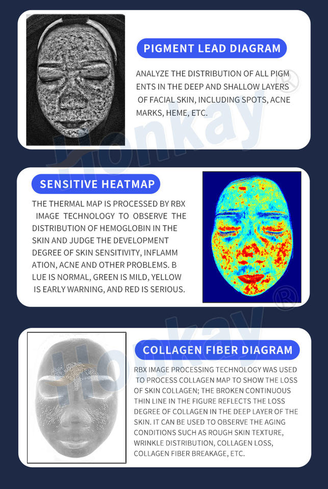 Acne di analisi, La pigmentazione di analisi, Analisi della pelle Senza Rughe, Rilevare Umidità Della Pelle, Analisi dell'acqua e dell'olio della pelle, Analisi della pelle e della subsalute, macchia UV