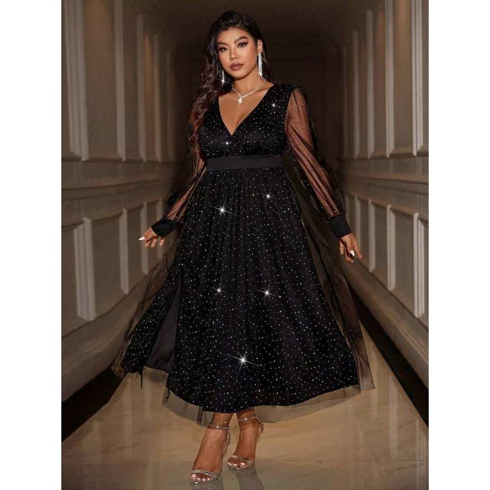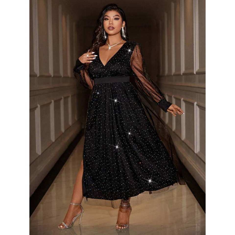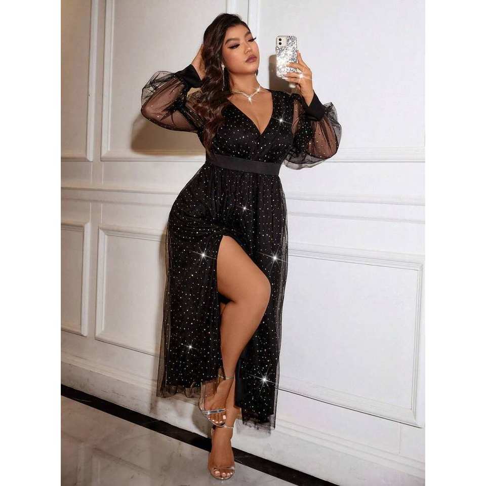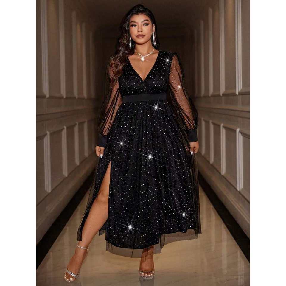 Celure Plus Size abito da sera a manica lunga tinta unita con alta fessura in Mesh con scollo a V profondo