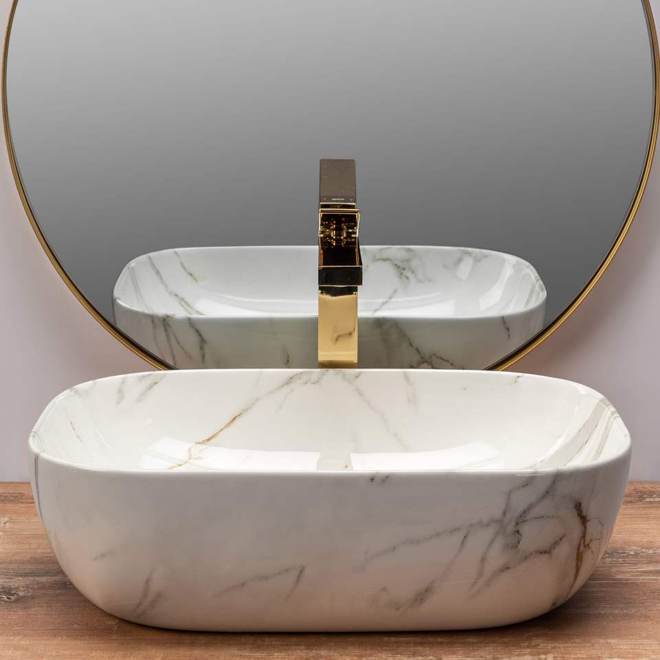Lavabo in ceramica bianco opaco in marmo lucido sopra il bancone lavabo lavabo lavabo di piccole dimensioni