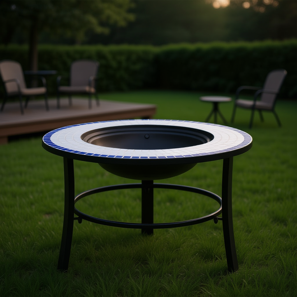 Braciere in ceramica a mosaico da 26,8 pollici blu e bianco, da esterno, autoportante, a bioetanolo