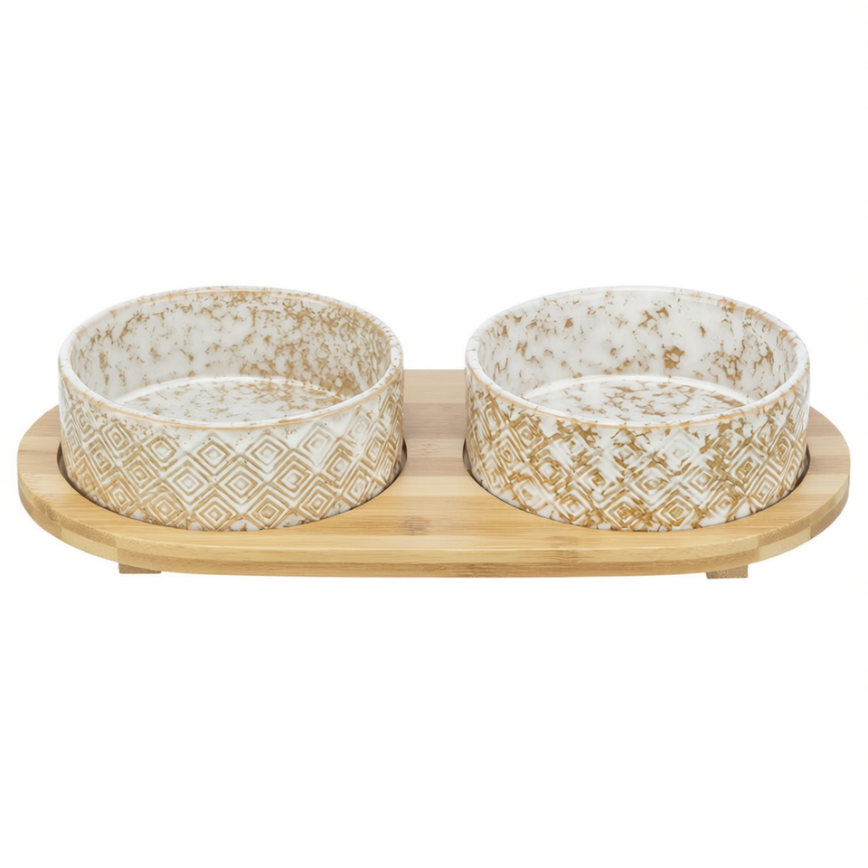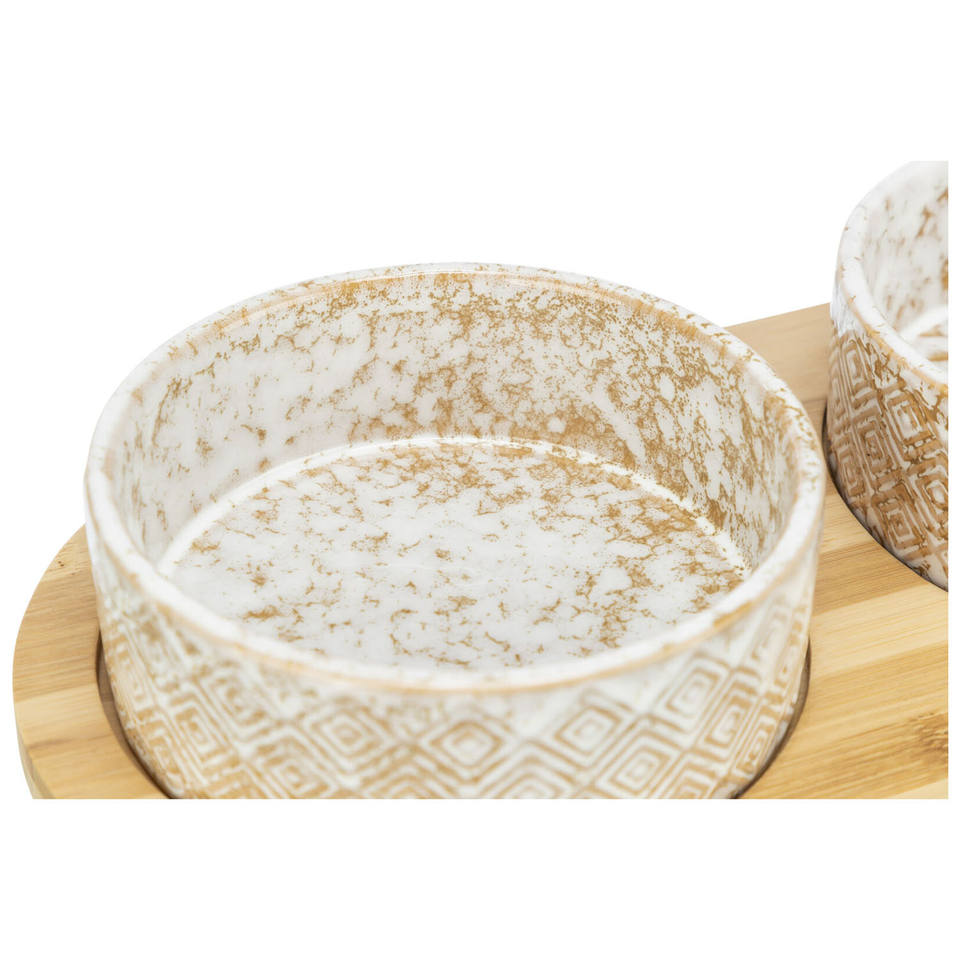 Set di ciotole in ceramica per animali domestici con vassoio in bambù, bianco, marrone chiaro, motivo geometrico, doppia stazione di alimentazione per cani e gatti