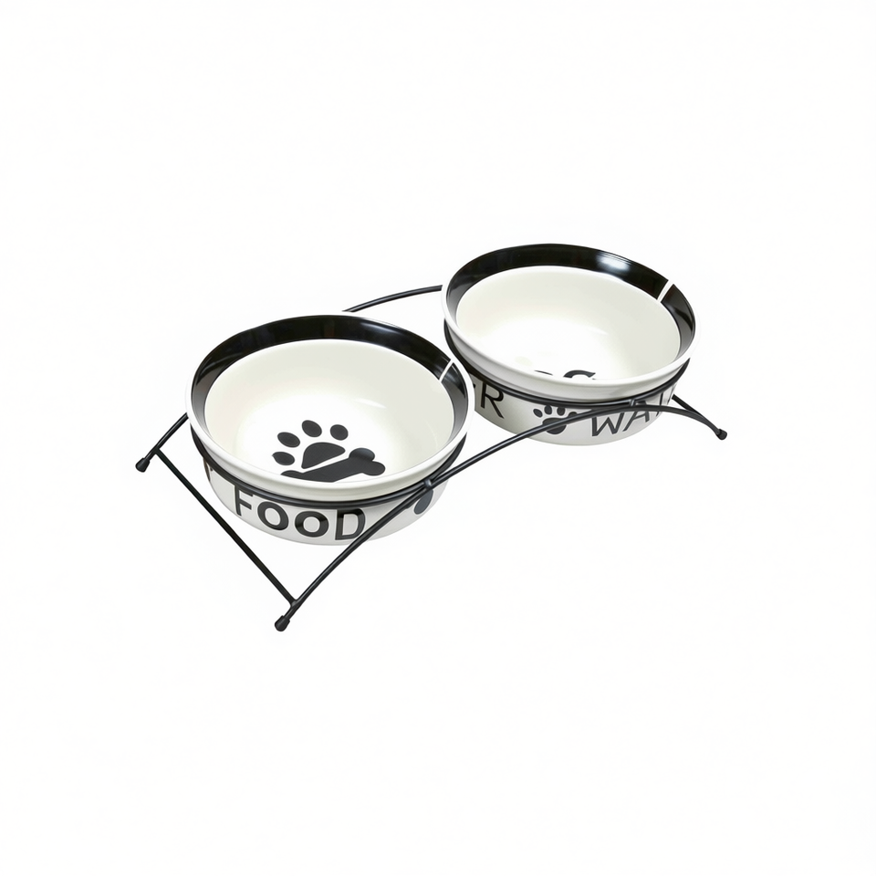 Set di ciotole in ceramica per animali domestici 2 x 1,6 L 20 cm bianco nero con supporto per cibo e acqua