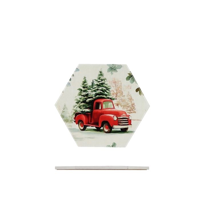 Sottopentola in Ceramica con Design Camion Rosso e Albero di Natale, Forma Esagonale per Uso in Cucina