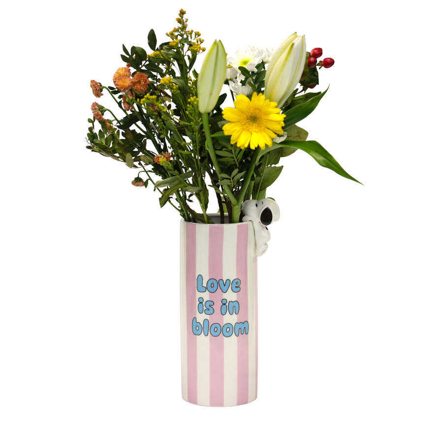 Vaso da Tavolo Contemporaneo in Ceramica con Strisce Rosa Dipinte e Design con Testo 'In Bloom' e Koala per Fiori