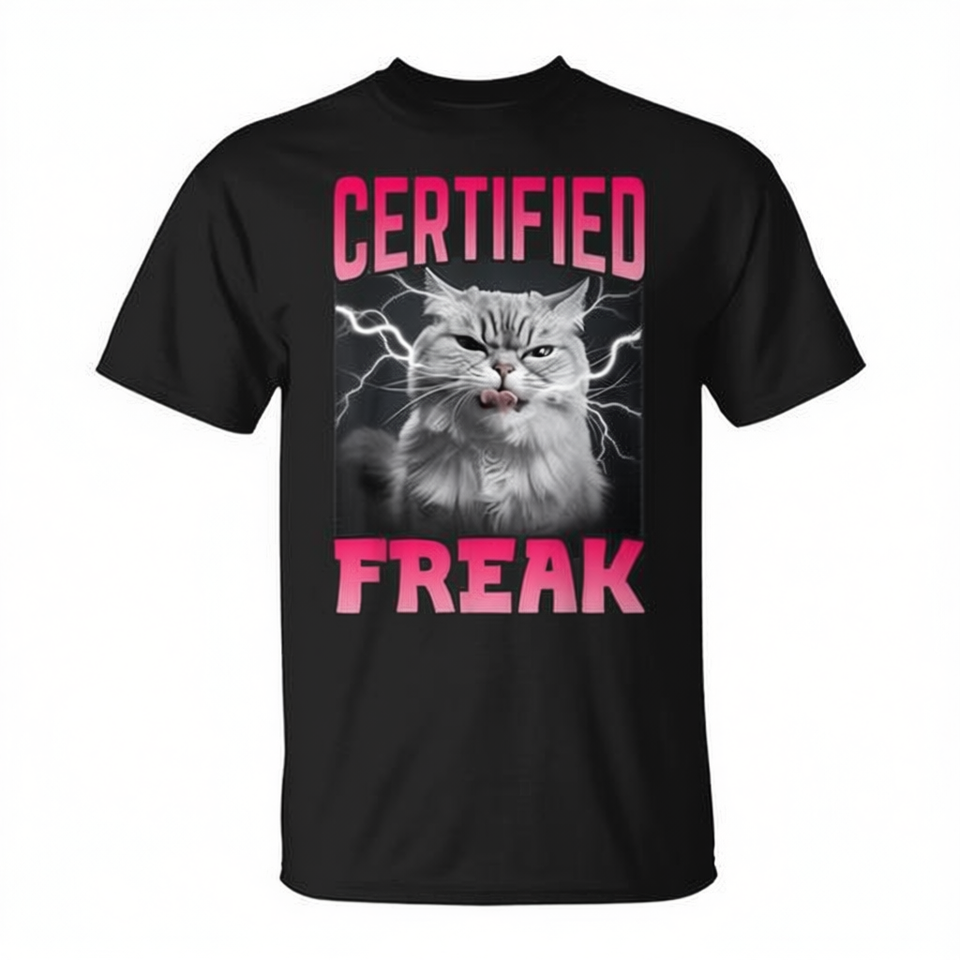 T-shirt certificata con meme del gatto pazzo, design divertente per gli amanti dei gatti