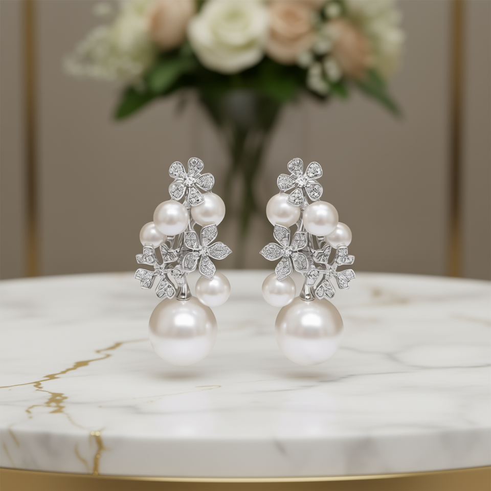 Champagne White Akoya Pearl Earrings 925 Silver Studs Flower Design Rhodium Plated AAA Grade Wedding Jewelry Women's Classic