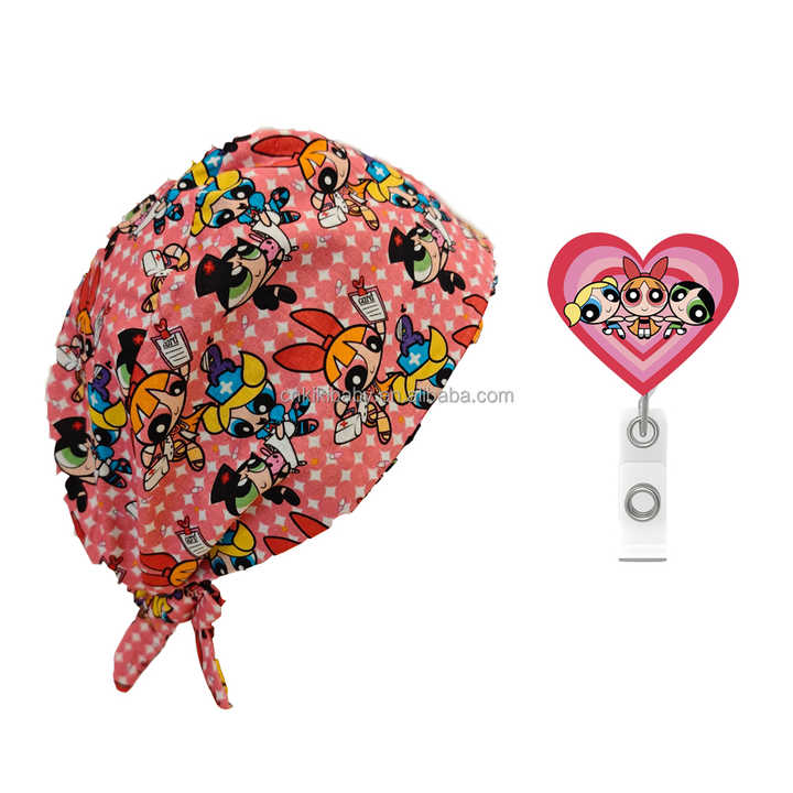 Character Print Scrub Nurse Working Caps Satin Lined Tie Back Unisex Surgical Caps Power Puff Design with Matching Badge Reels