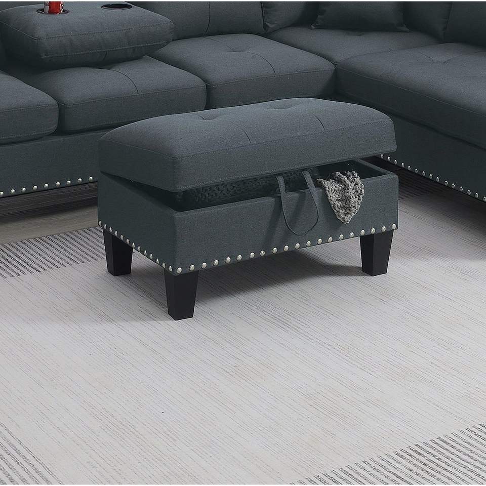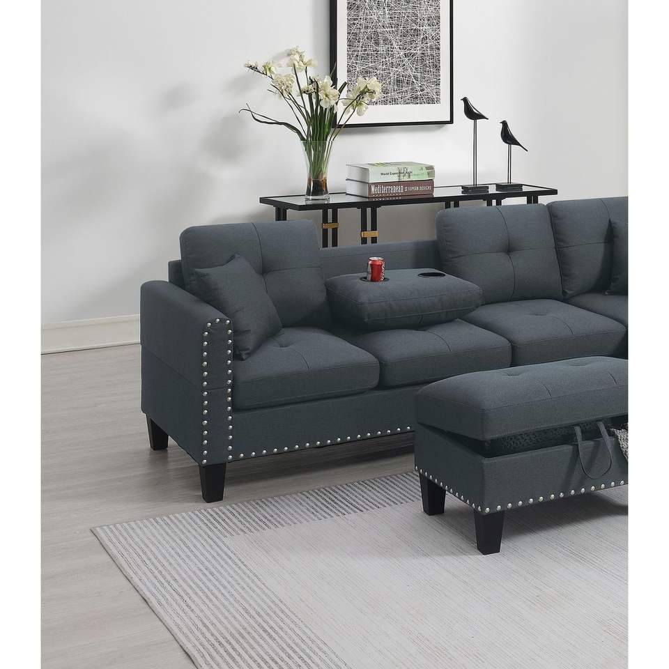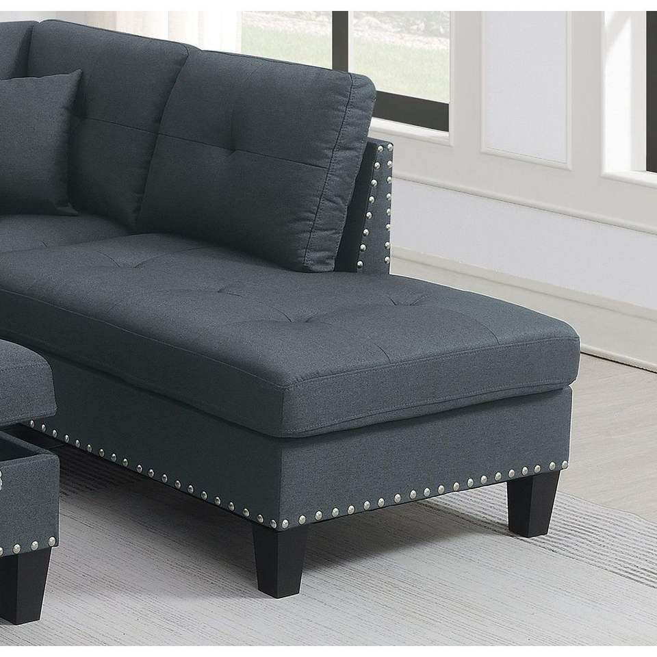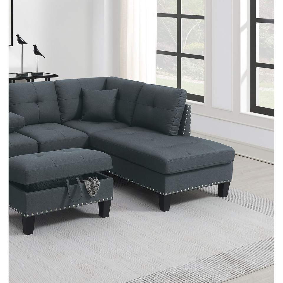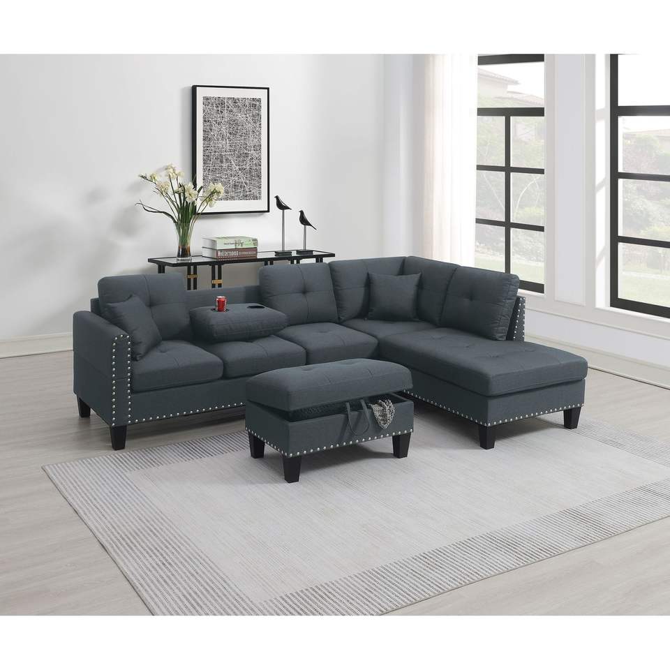Set Divano Sezionale 3 Pezzi in Tessuto Lino Color Carbone per Soggiorno, Include Divano LAF, Chaise Longue RAF, Pouf Contenitore e Portabicchieri