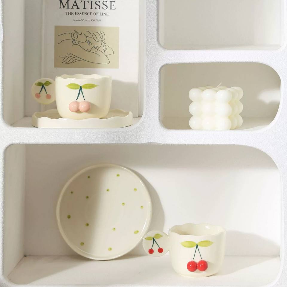 Charming Hand Painted Ceramic Coffee and Tea Cups Set Cute Cherry Design for Breakfast Drinkware Ins Cute Cherry Cup Saucer