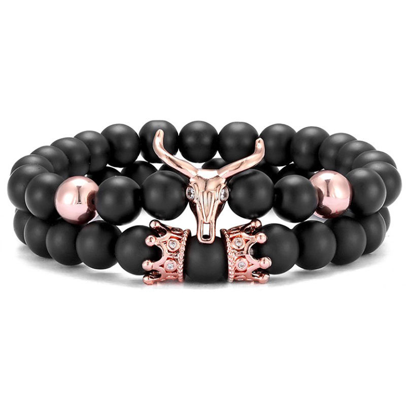 Bracciale Elastico Artigianale da Uomo con Ciondoli Personalizzati in Onice Opaco e Corno di Toro (MB18185)