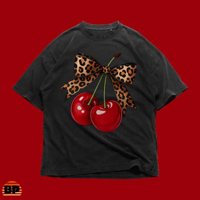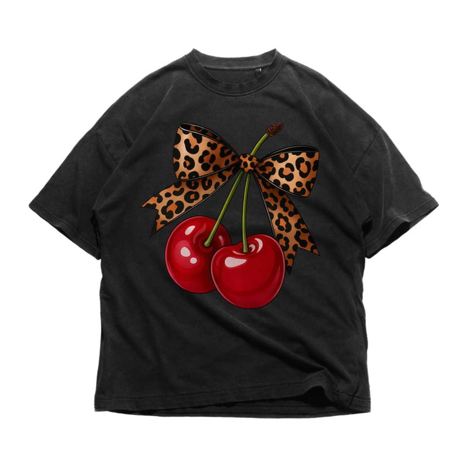 T-shirt unisex in cotone pesante con fiocco leopardato Cherry, divertente maglietta con grafica, abbigliamento casual alla moda, regalo per lei, outfit estivo femminile