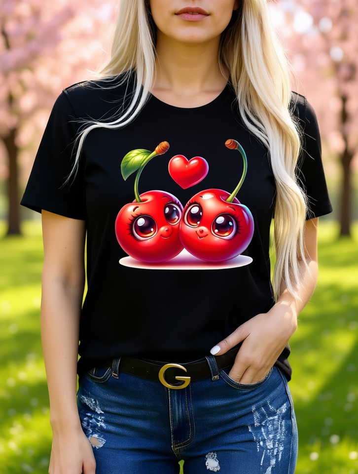 Cherry Love Women's Round Neck T-Shirt Valentine's Day Cartoon Heart Print Casual Sporty Short Sleeve 100% Cotton Jersey