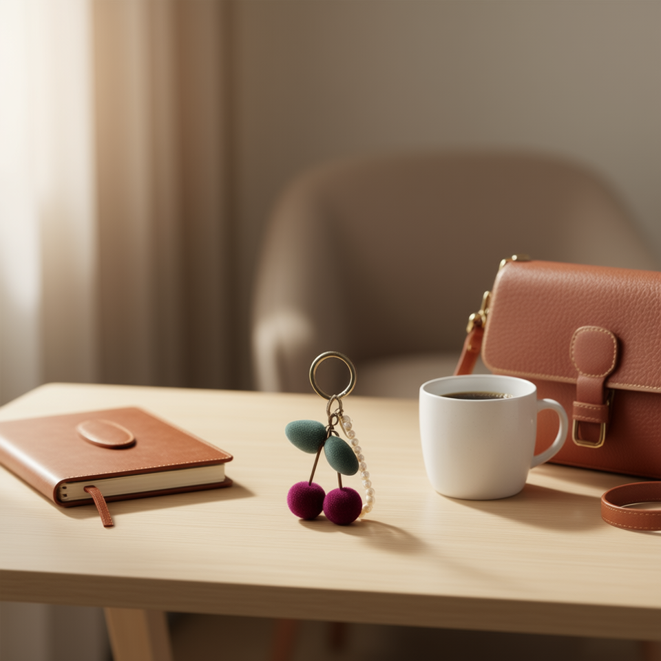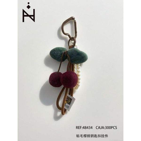 Portachiavi con ciondolo a forma di ciliegia con perle finte e palline di velluto per borsa o chiavi