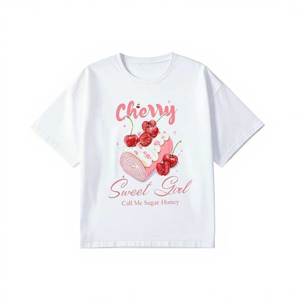 Cherry Pink Letter Print Women's White Neck Short Sleeve Casual Spring Summer T-Shirt Machine Washable Cotton Jersey Sweet-Line