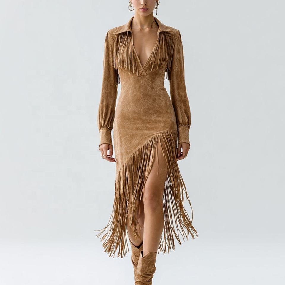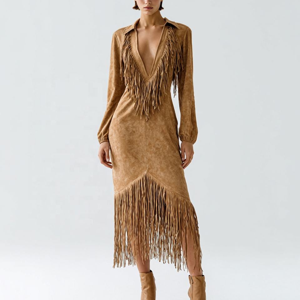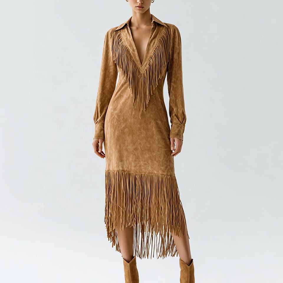 Chic autunno donna stile retrò con frange sartoriale dettaglio finto camoscio camicia colletto a manica lunga abito Midi marrone per donna