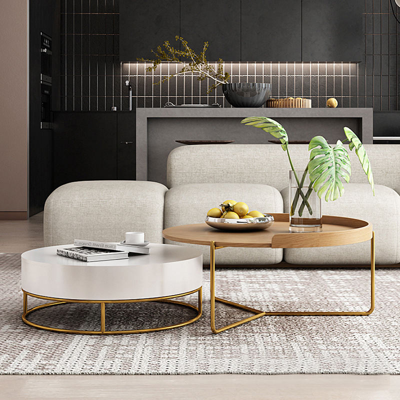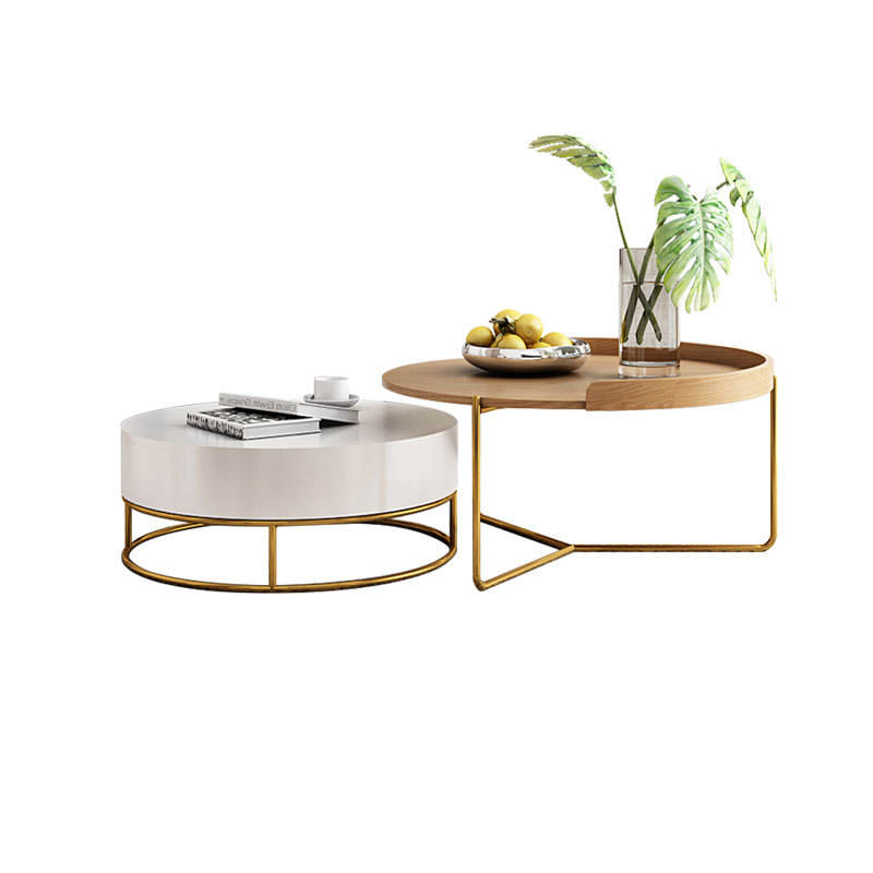 Tavolino da Caffè Chic con Piano Rotondo Doppio in Metallo Dorato e Base in Legno