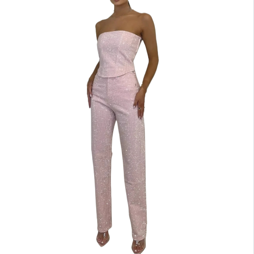 Elegante Completo Estivo da Donna Lunghezza al Ginocchio con Top Lucido Senza Spalle e Pantaloni con Diamanti per il Mercato Europeo e Americano