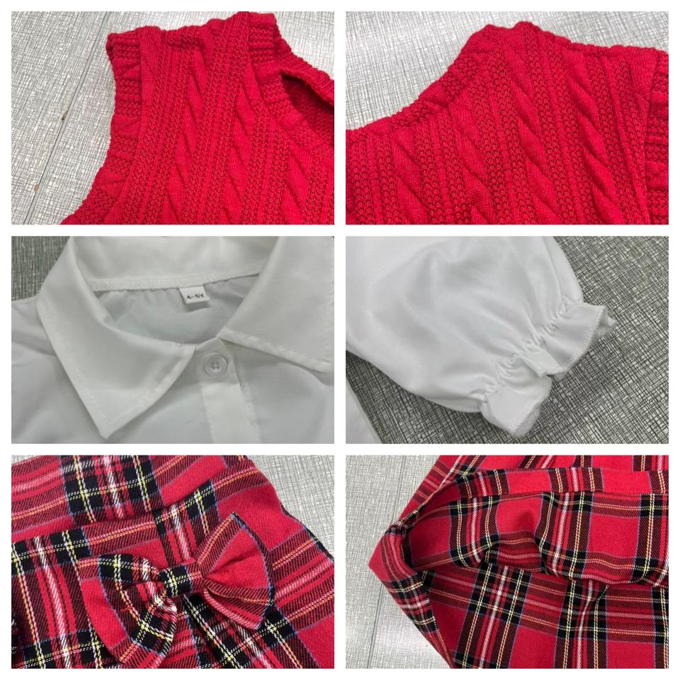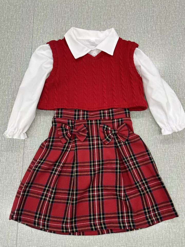 Child Girl Clothes Girls' Casual Three-Piece Set White Long Sleeve Shirt Red Vest Plaid Skirt Suit Festival Celebrations