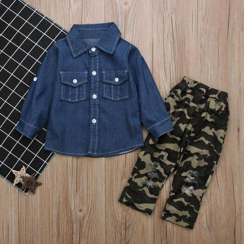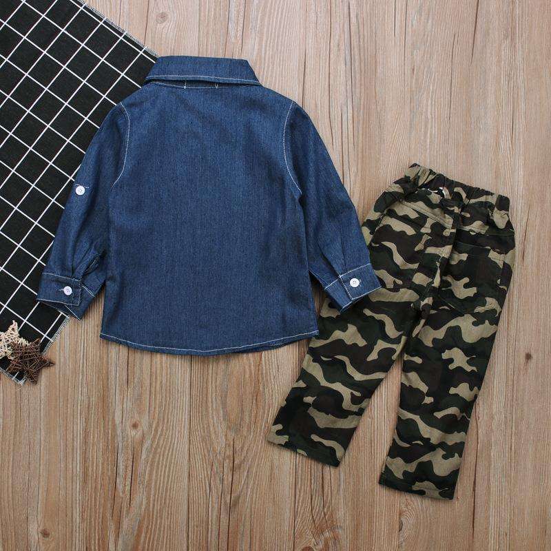 Insieme Dei Vestiti di Estate Delle Ragazze dei bambini Army 1-5 anni della ragazza Del Denim Manica Lunga T Shirt E Pantaloni Mimetici vestito