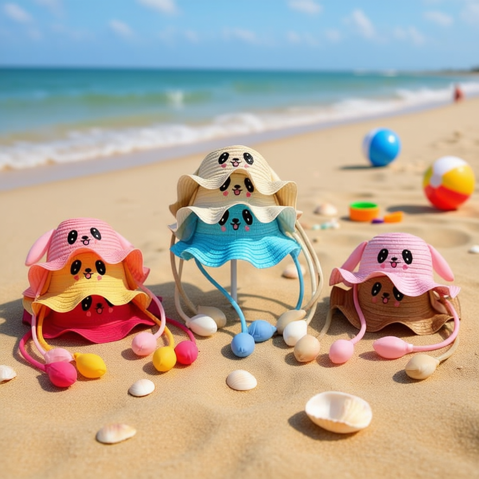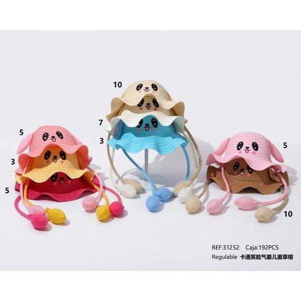 Cappello di paglia con viso sorridente a forma di cartone animato per bambini, con airbag e bordo ondulato, regolabile per la protezione solare estiva dei bambini