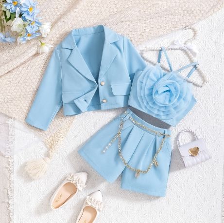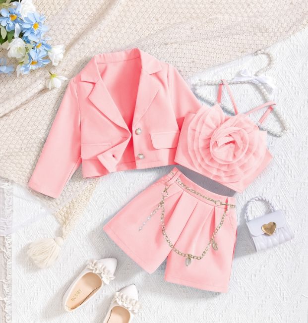 Abbigliamento per bambini set vestiti per ragazze primavera autunno giacca 3D gilet Shorts con catena di perle vestiti da bambina
