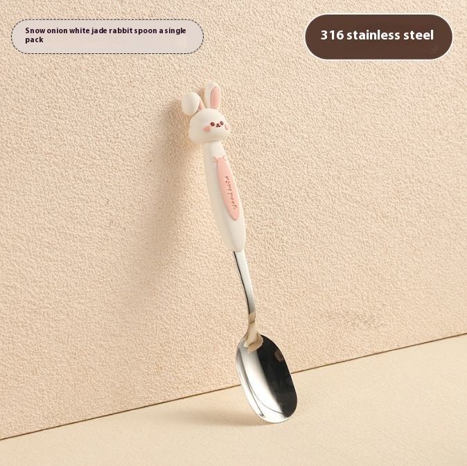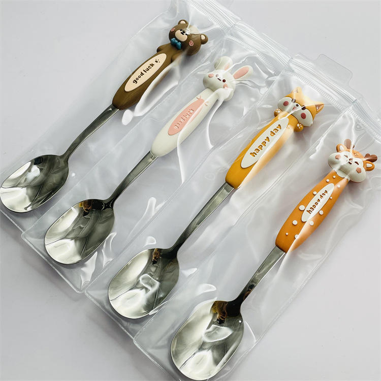 Cucchiaio Monouso per Bambini in Acciaio Inox 316 Placcato Oro, Design Domestico con Cartoni Animati, Volpe, Coniglietto, Cervetto, in Silicone
