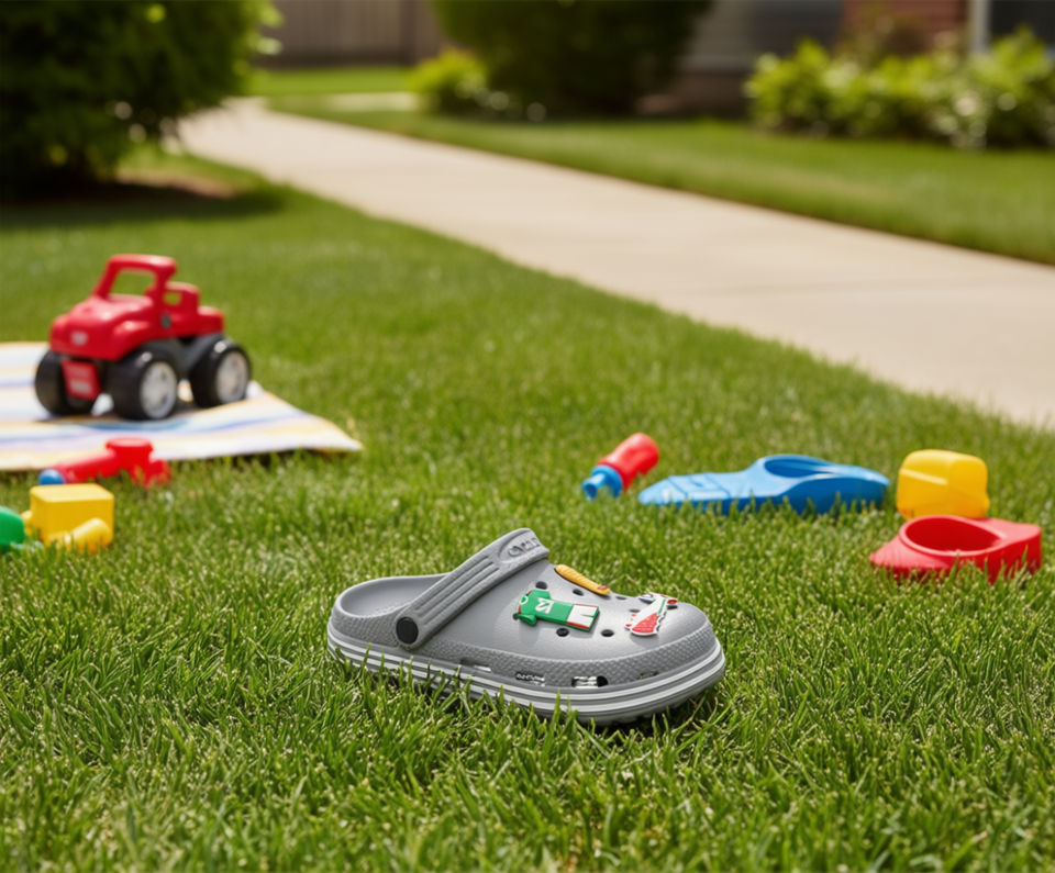 Zoccoli grigi per bambini taglia 20 con spille animate, per l'uso estivo all'aperto