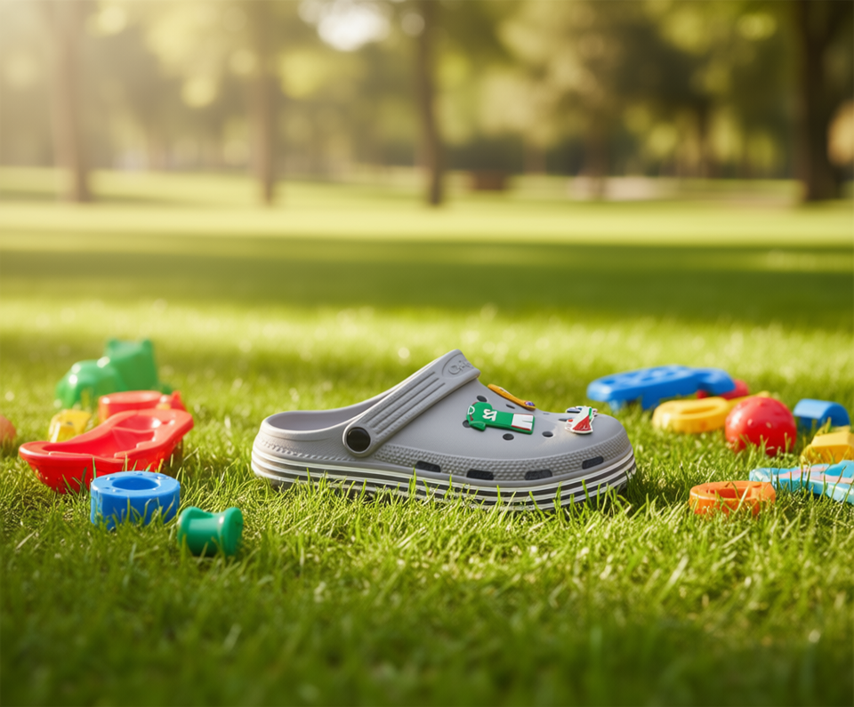 Zoccoli grigi per bambini con spille animate, taglia 19, estivi, suola in EVA, punta tonda