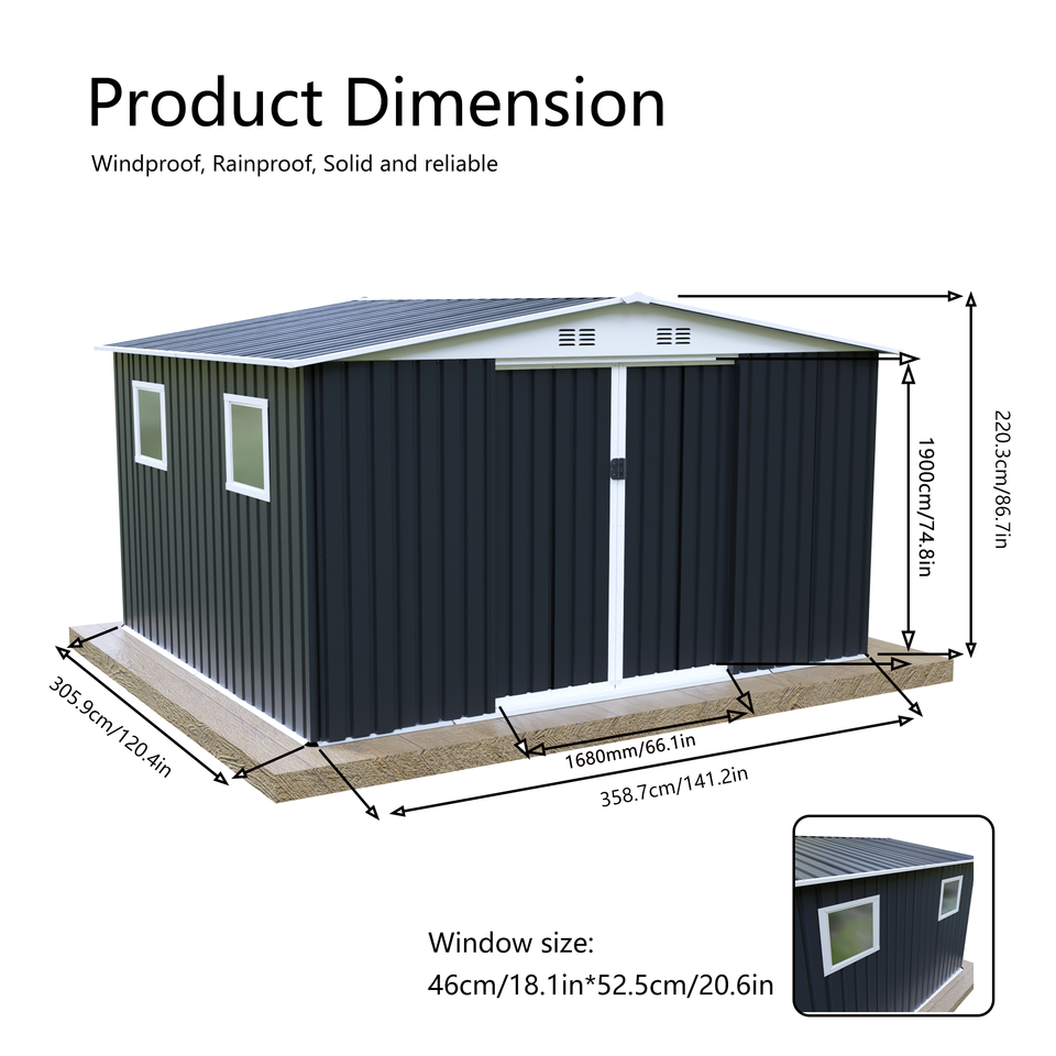 Nome del prodotto:Capanno da Giardino per Esterni 12FTx10FT con Tetto a Punta Grigio e 4 Finestre