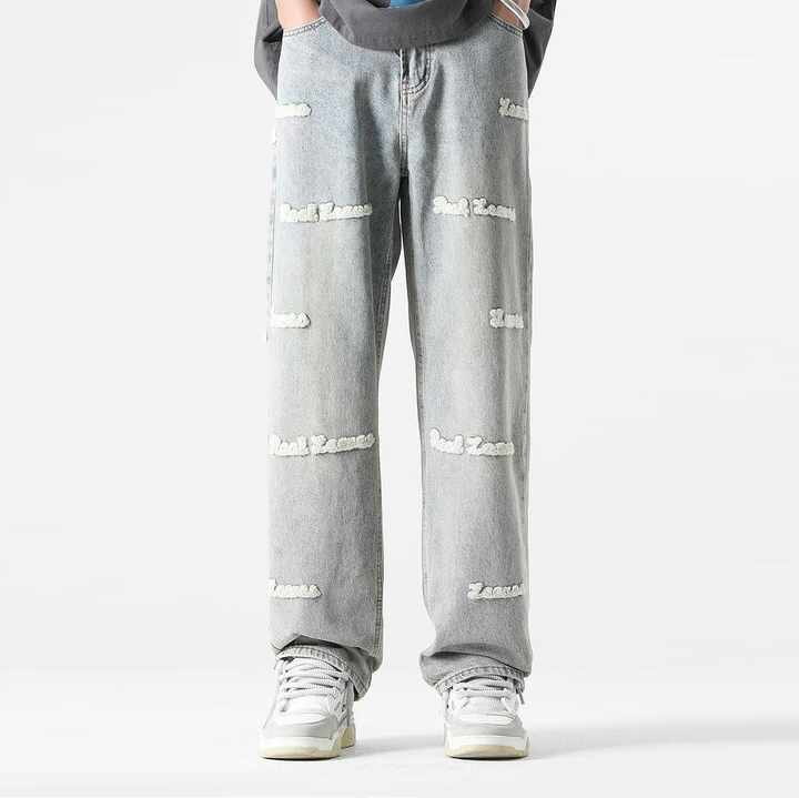 China Wholesale Men's Hip Hop Style Jeans Loose Wide Leg Long Trousers with Embroidered Letters Light Wash Breathable Design