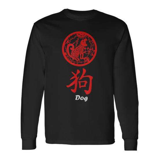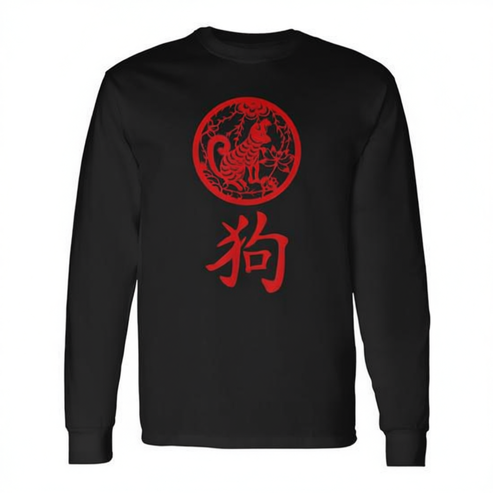T-Shirt a Maniche Lunghe del Capodanno Cinese con Cane dello Zodiaco, Design Rosso Unisex, Stampa Serigrafica, Abbigliamento Promozionale per Adulti