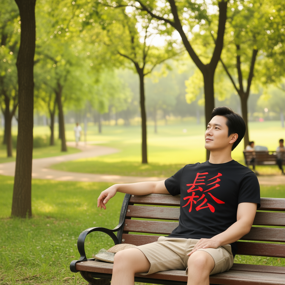 T-shirt con stampa simbolo cinese 'Relax' nero e rosso, unisex, girocollo, manica corta, serigrafia