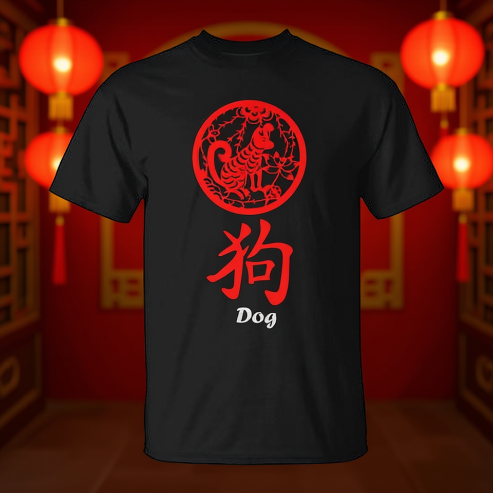 T-Shirt con Zodiaco Cinese del Cane, Design Rosso, Collo Tondo, Manica Corta, Unisex per Adulti, Abbigliamento Promozionale con Stampa Serigrafica