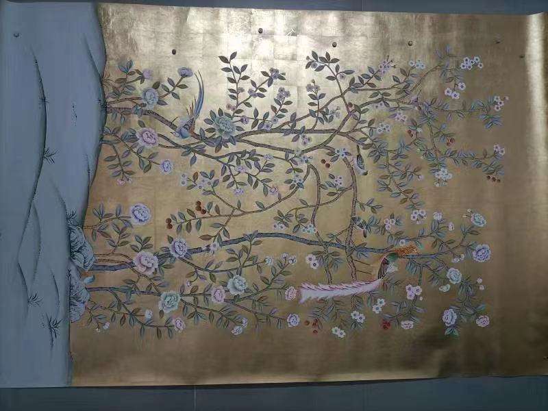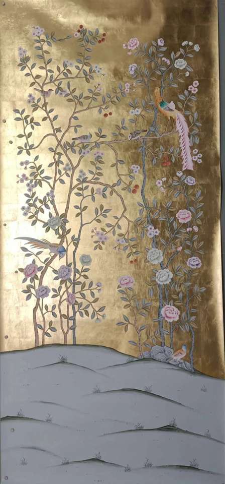 Chinoiserie Hand Painted Wallpaper With Gold Leaf Sheets