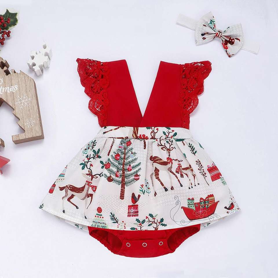 Christmas 2020 Baby Jumpsuit with Headband Baby Girl Lace Skirt Romper