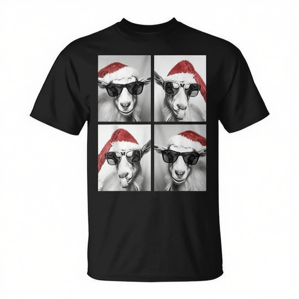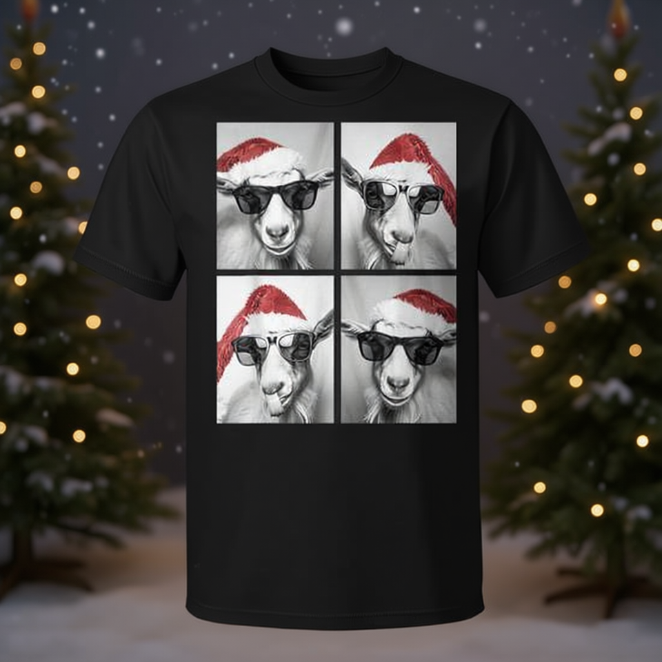 T-shirt con meme festivo di capre natalizie con occhiali da sole e cappello da Babbo Natale