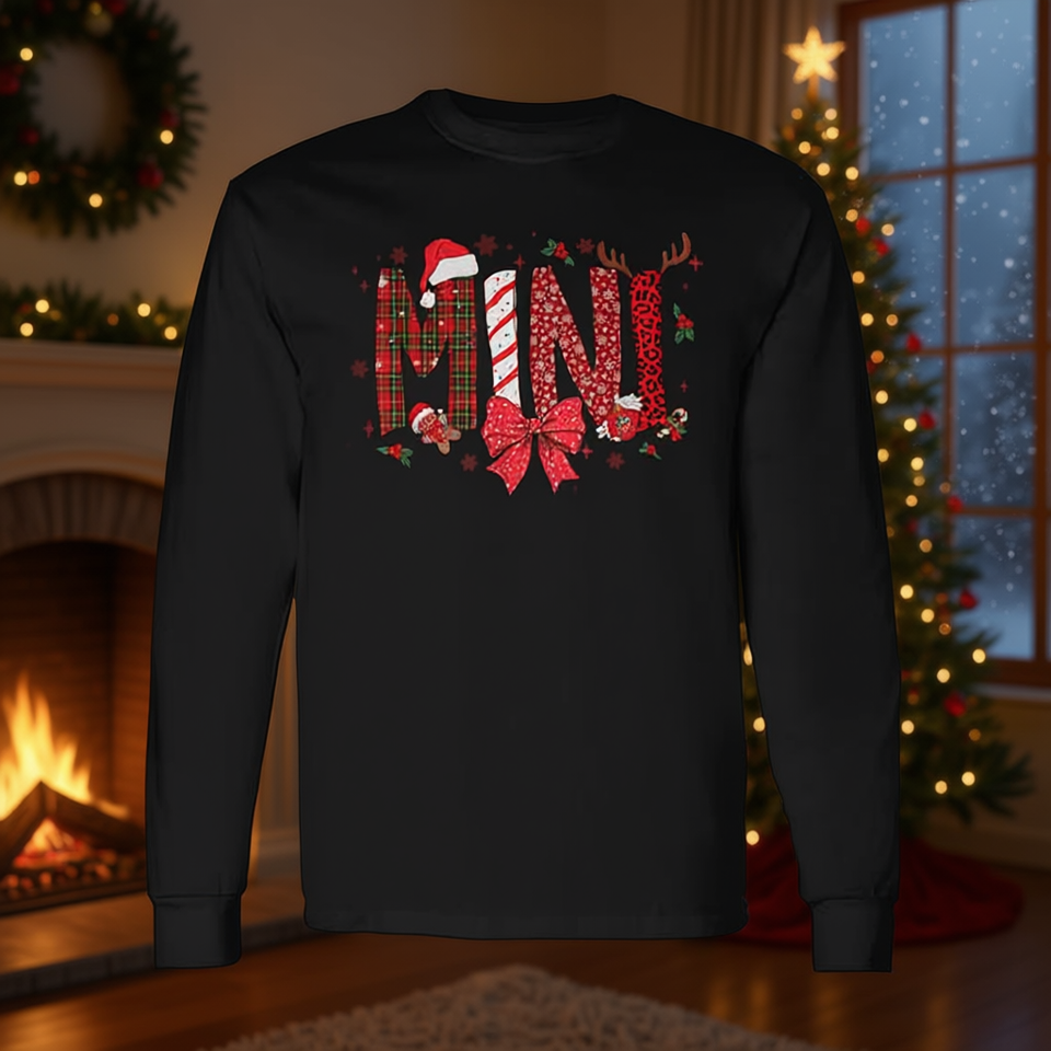 Maglietta natalizia a maniche lunghe con mini fiocco a quadretti e stampa leopardata