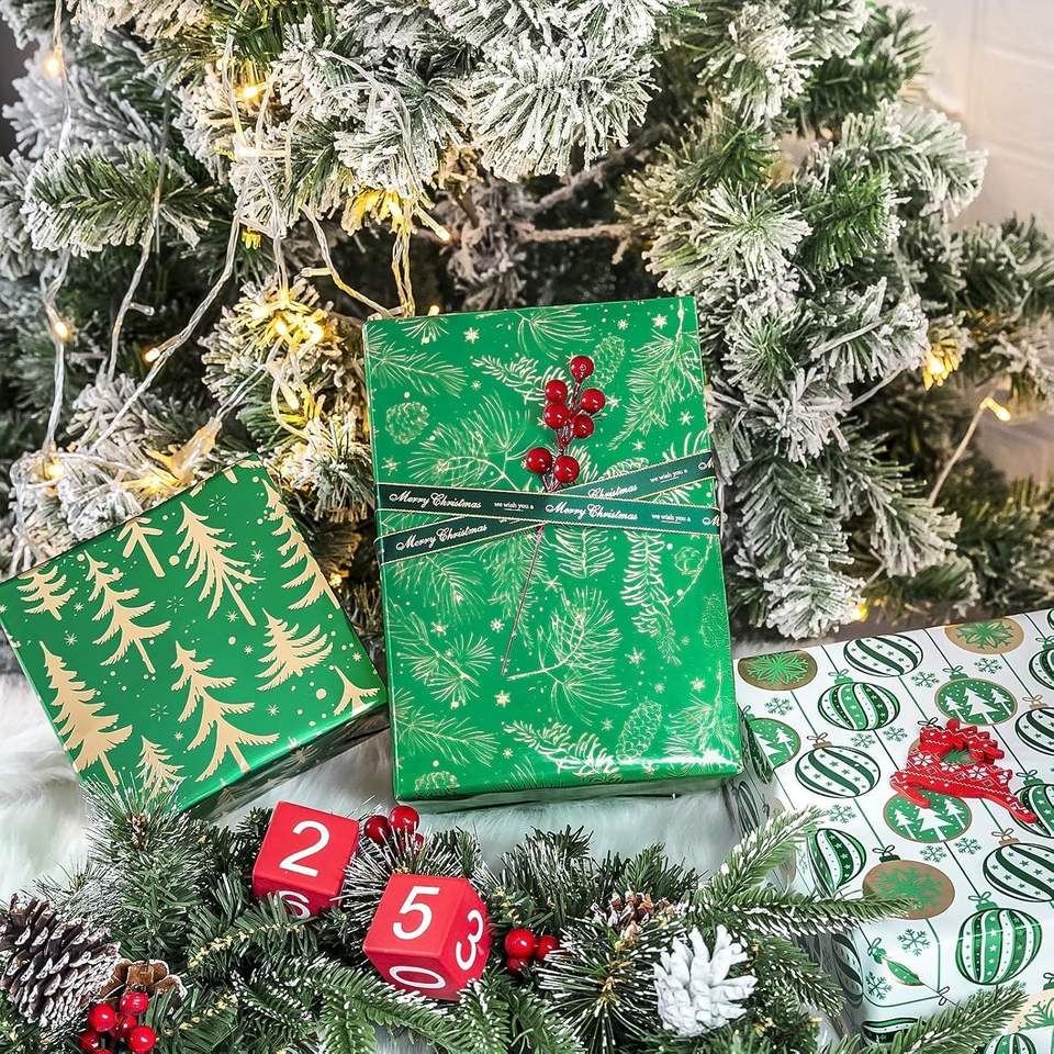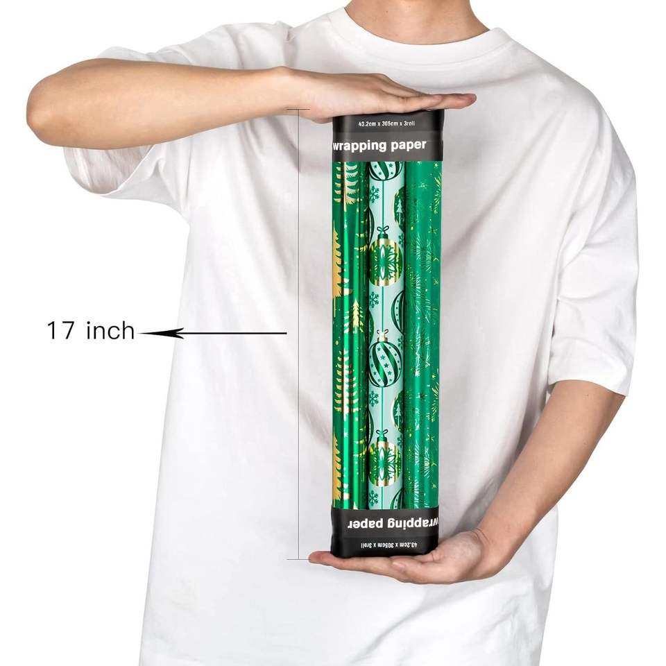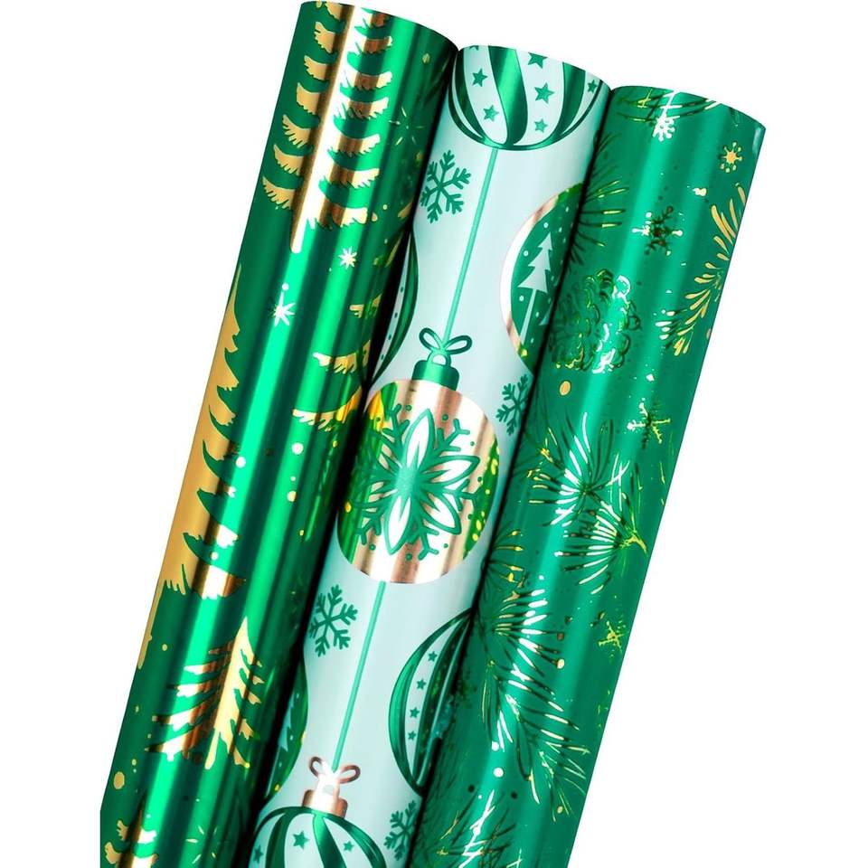 Rotolo di Carta da Regalo Natalizia Mini 43 cm x 305 cm, 3 Diversi Design in Lamina Metallica Verde per Confezioni