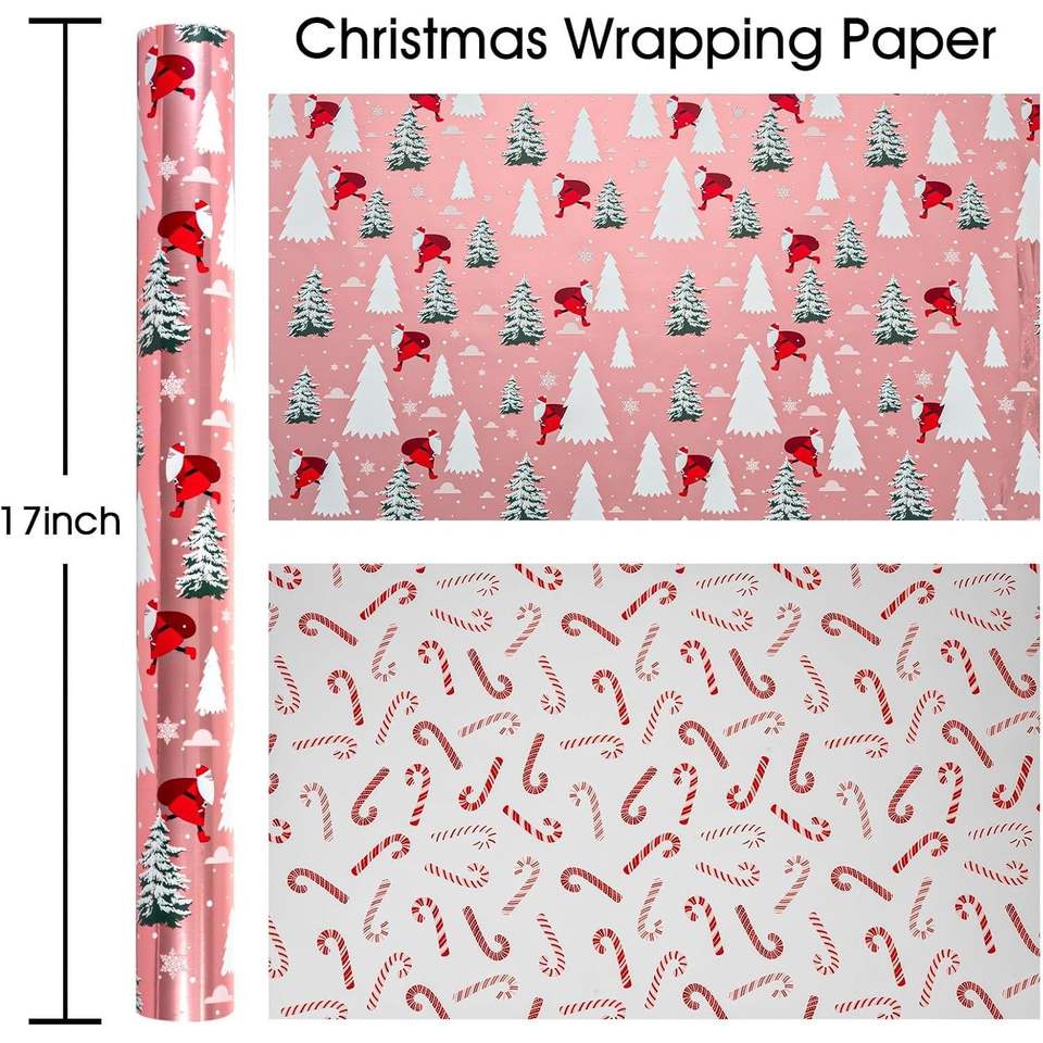 Rotolo di Carta da Regalo Reversibile Natalizia Rosa con Lamina Metallizzata, Design Babbo Natale, Albero e Bastoncini di Zucchero su Sfondo Innevato - Forniture per le Feste