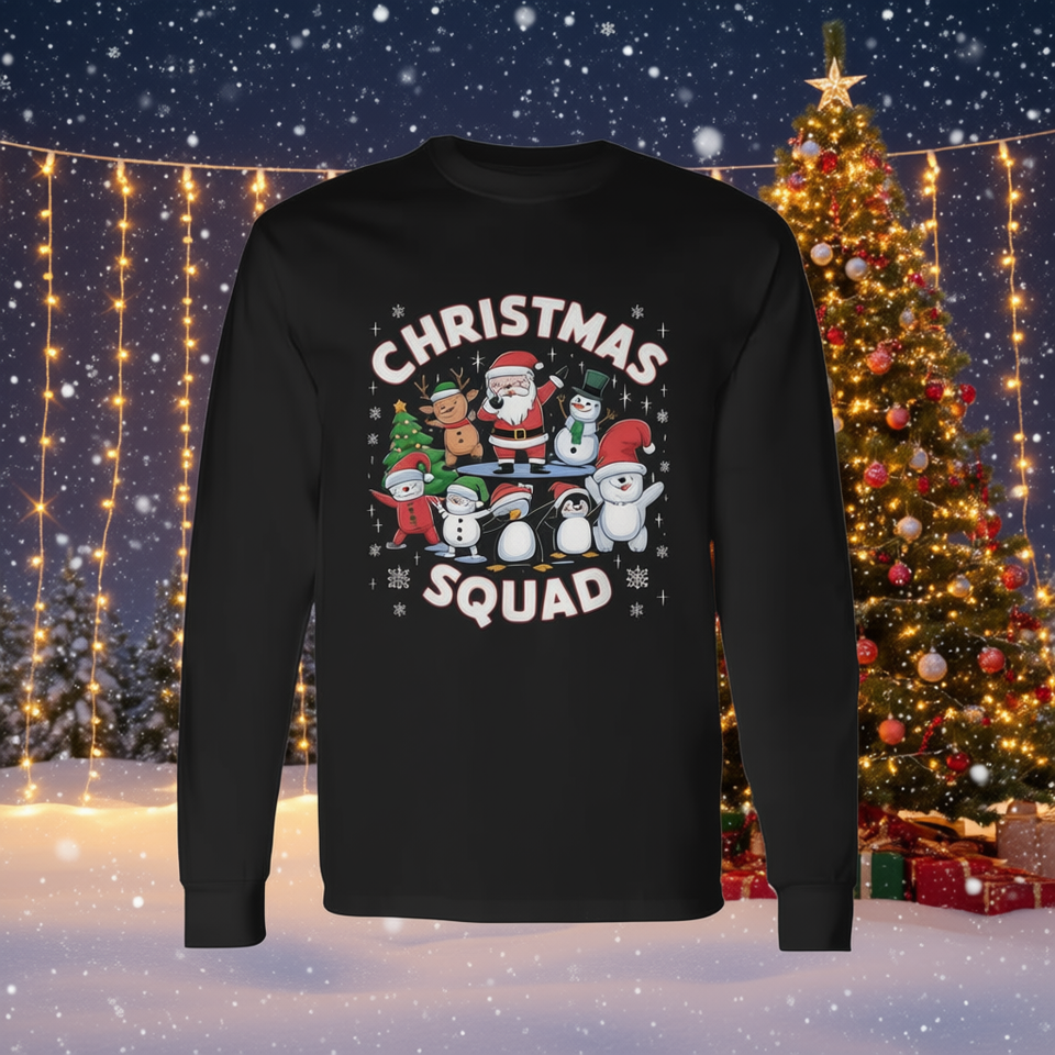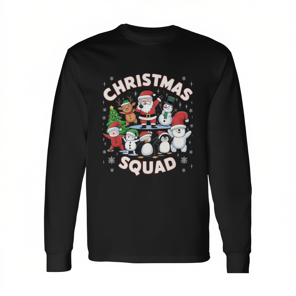 Maglietta a maniche lunghe con stampa natalizia di Babbo Natale, elfo, renna, pupazzo di neve e albero di Natale