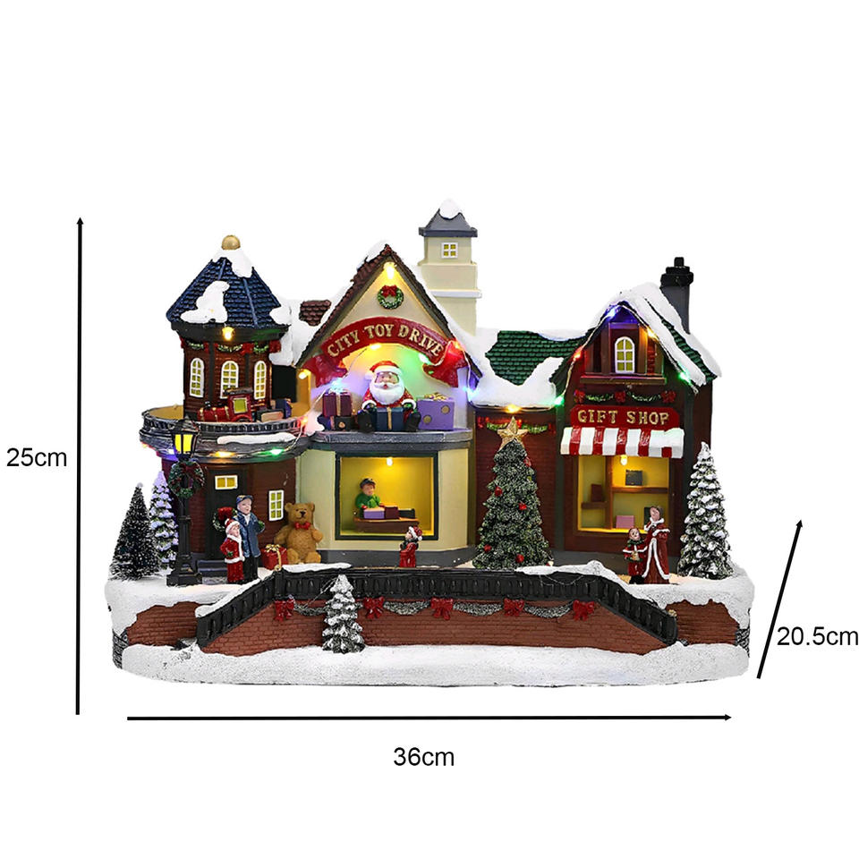 Piazza del Mercato Cittadina Natalizia con Luce a LED e Trenino in Movimento, Manufatto Natalizio in Resina, Scultura in Resina Dipinta a Mano