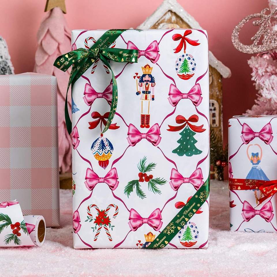 Rotolo di Carta da Regalo Natalizia 43 cm x 10 m, Design Schiaccianoci Bianco con Albero, Campana, Fiocco, Pavo, Bastoncino di Zucchero, Forniture Festive per le Feste