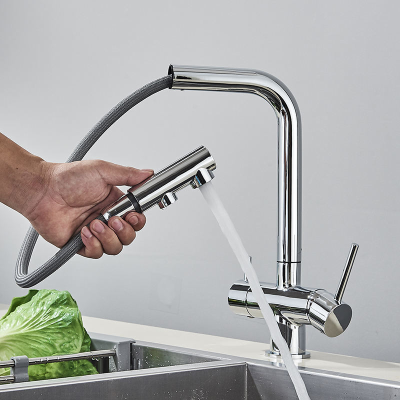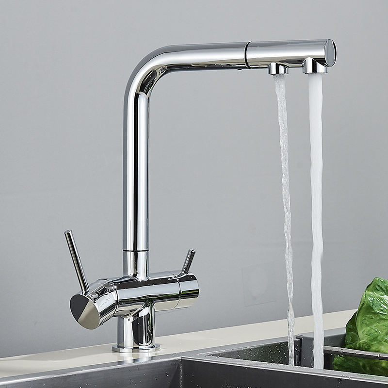 Chrome Brass Pull Out Filtered alibaba Kitchen Faucet Dual Handle Hot Cold Drinking Water 3-Way Filter Purification Mixer Taps