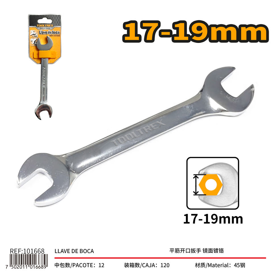 Chiave a Forchetta Piatta Tooltrex 17-19mm, Finitura a Specchio, Metrica, Doppia Estremità, Manuale