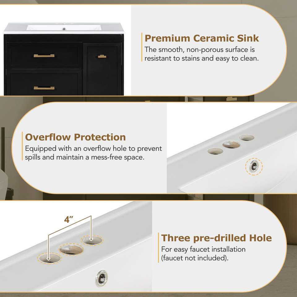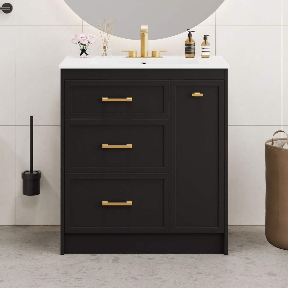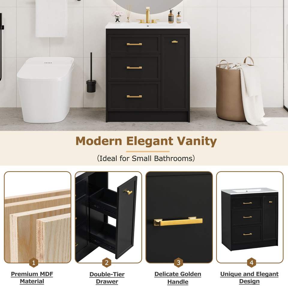 Mobile bagno classico da terra da 30 pollici con tre cassetti e un lavabo a doppio strato, con maniglia lunga dorata, set mobiletto bagno da 30 pollici
