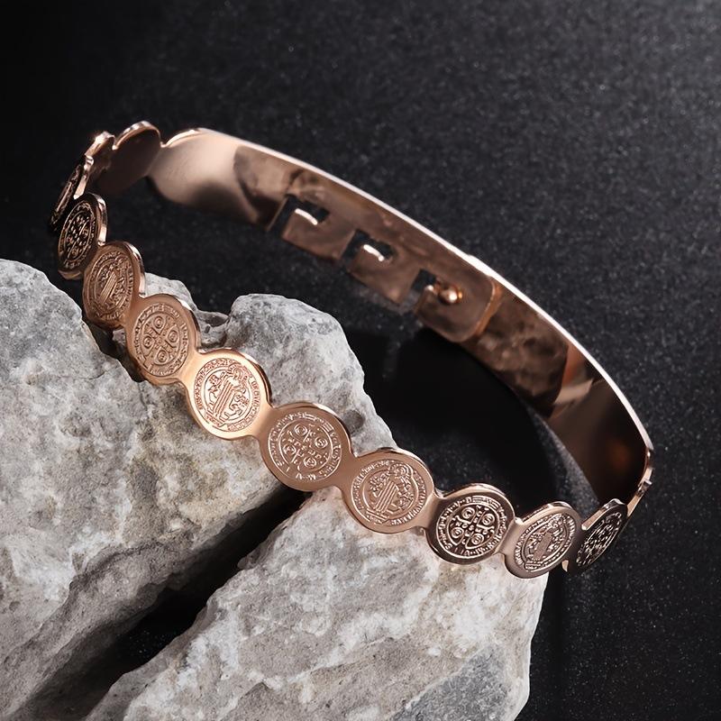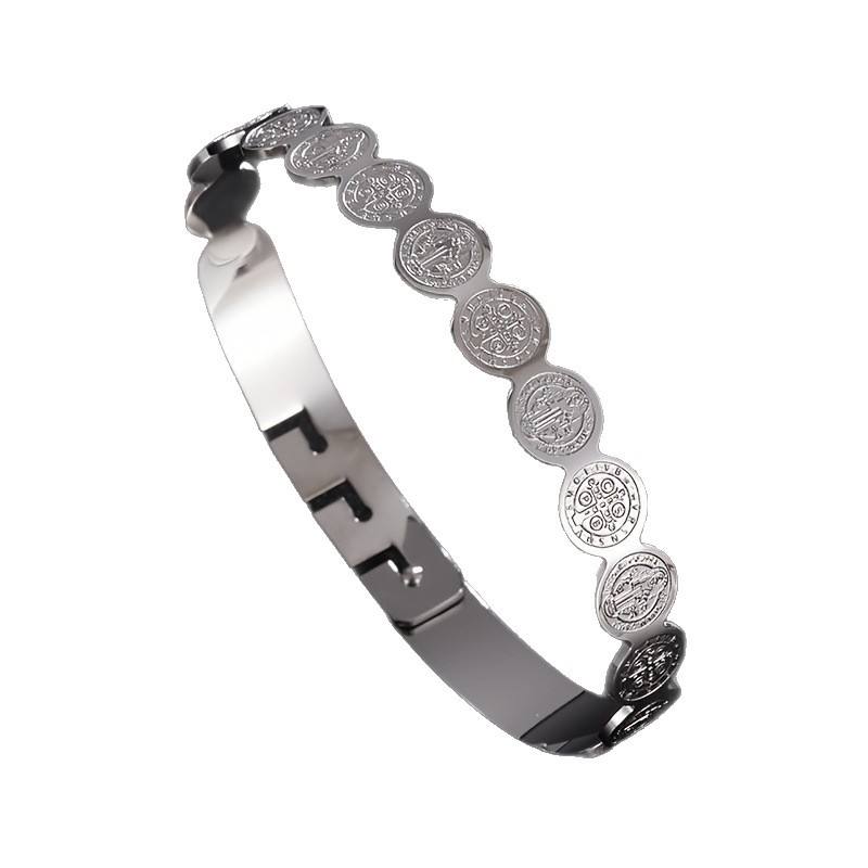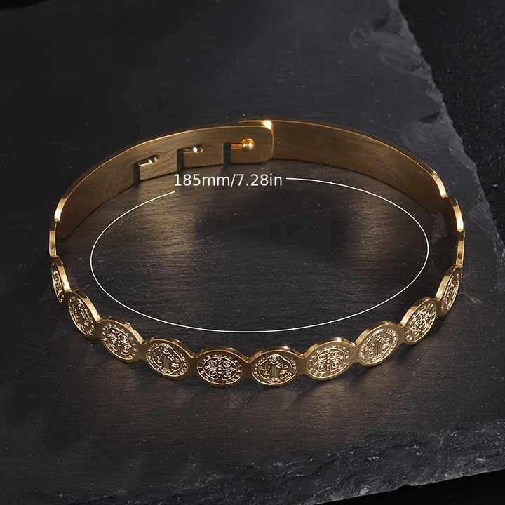 Classico Bracciale Sportivo/Casual in Acciaio Inossidabile 316 Placcato Oro con Cornice di San Benedetto, Gioiello Amuleto Cattolico di Gesù per Uomini e Donne