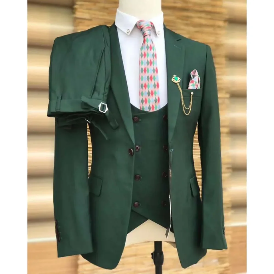 Classic Elegant Green Men's 3 Piece Suits Jacket Pants Vest Blazer One Button Notched Lapel Flat Costume Homme Slim Fit Outfits